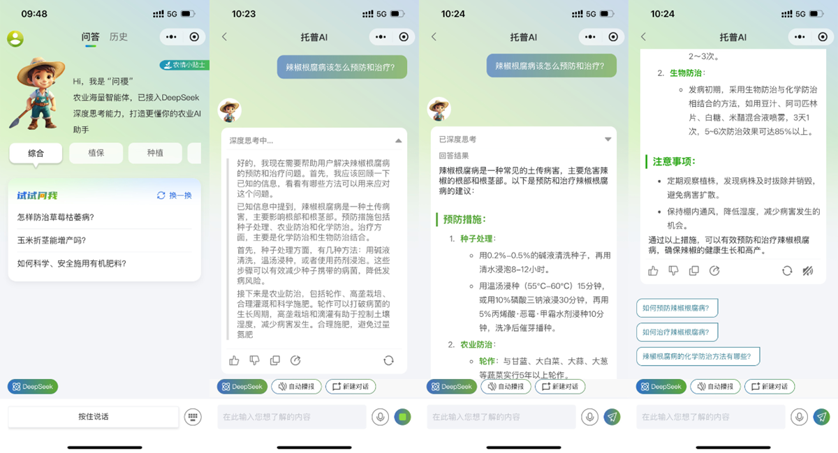 践行“科技普惠”理念,托普云农将“问稷”微信小程序对公众免费开放使用,打造农业从业者身边的AI专业顾问。例如“辣椒根腐病该怎么预防和治疗”“如何评估亲本的遗传多样性和配合力”“怎么提高河套灌区春播玉米的播种质量”“坐标黑龙江,帮我规划一下今年的水稻种植方案”等,面对种植、植保、育种、作物、土肥等农业科研、生产生活中的各类问题,“问稷”都能给出专业解答,还能根据用户的提问,自动延伸并生成用户可能关心的相关问题,帮助用户更精准获取想要的答案或建议。