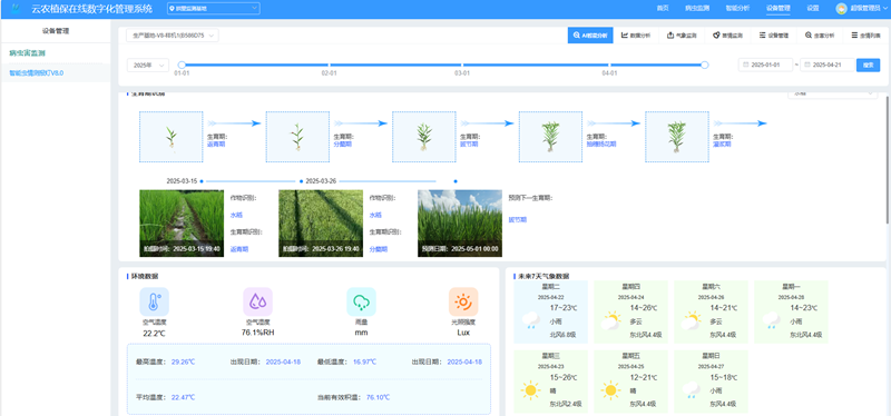 2、智能识别作物生育期:高清苗情摄像头搭配算法模型,智能识别水稻等作物生育期。