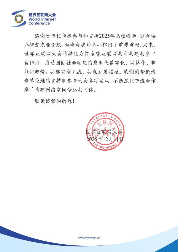 近日,浙江托普云农科技股份有限公司接连收到中国农学会 农业农村部人力资源开发中心,世界互联网大会的感谢信,这是行业对我们在农业科技领域深度参与、创新贡献的双重肯定!
